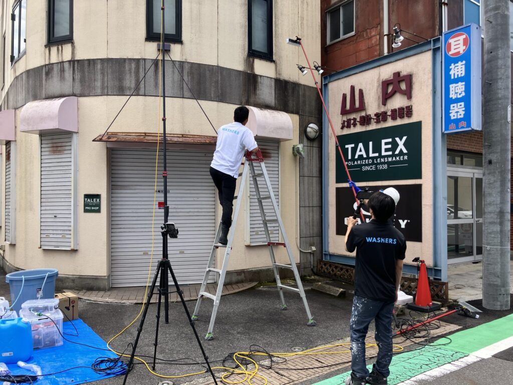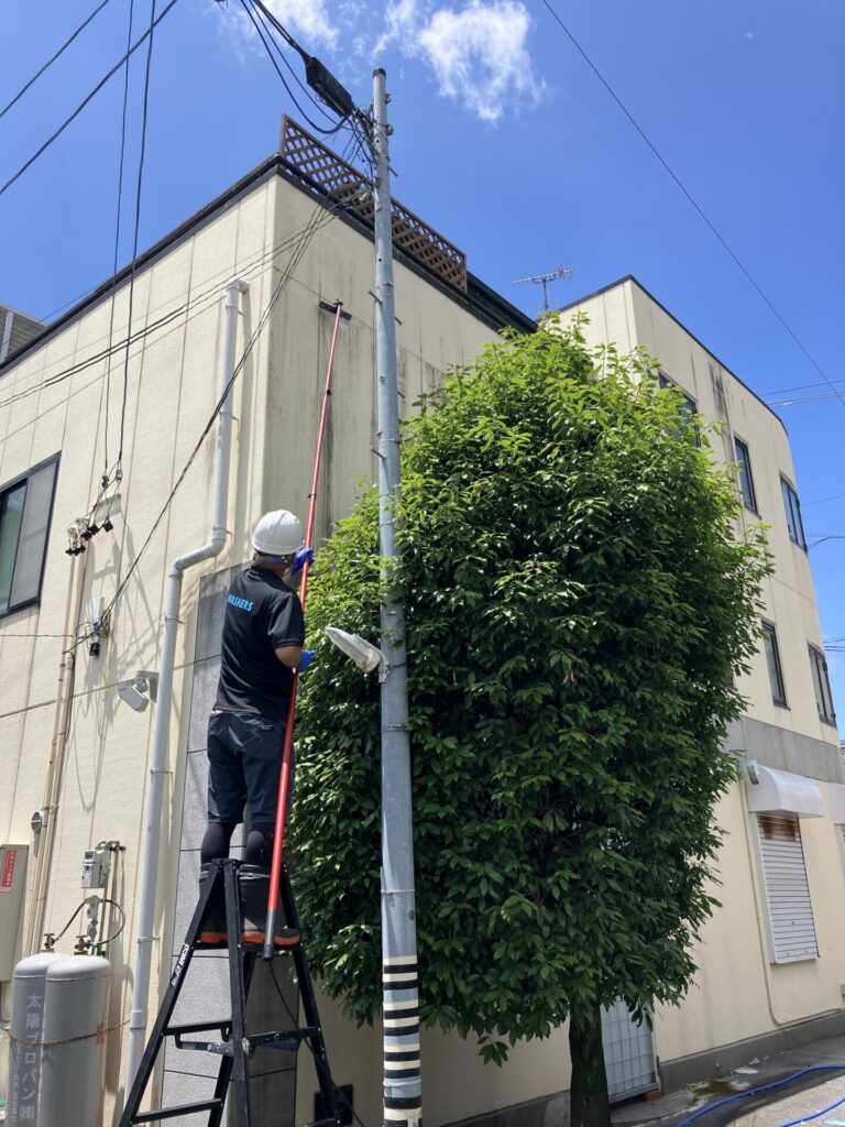 【中津川市】築27年・山内メガネ様の外壁洗浄|塗装せずにここまでキレイに! 洗浄風景