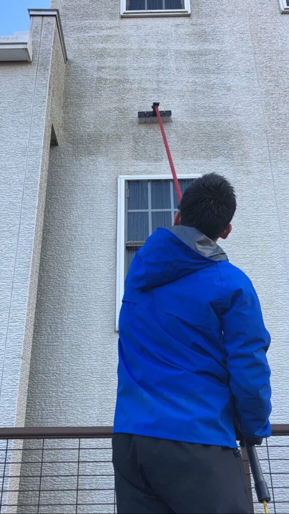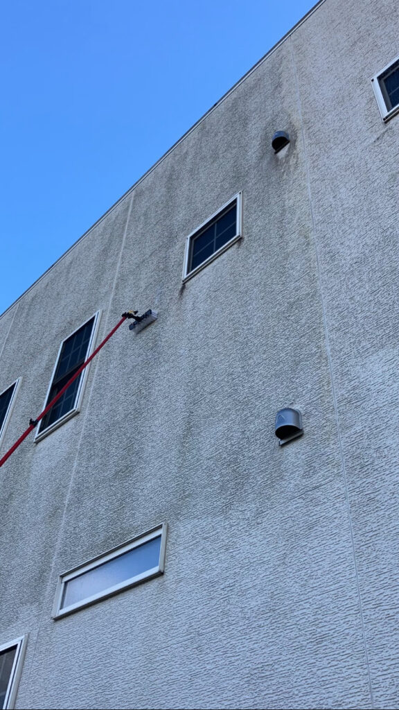 ウォッシャーズのオリジナル薬剤を用いて、外壁2面を丁寧に洗浄。