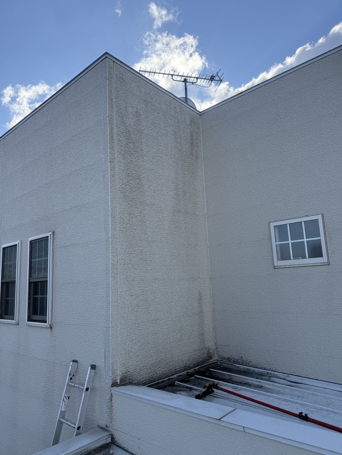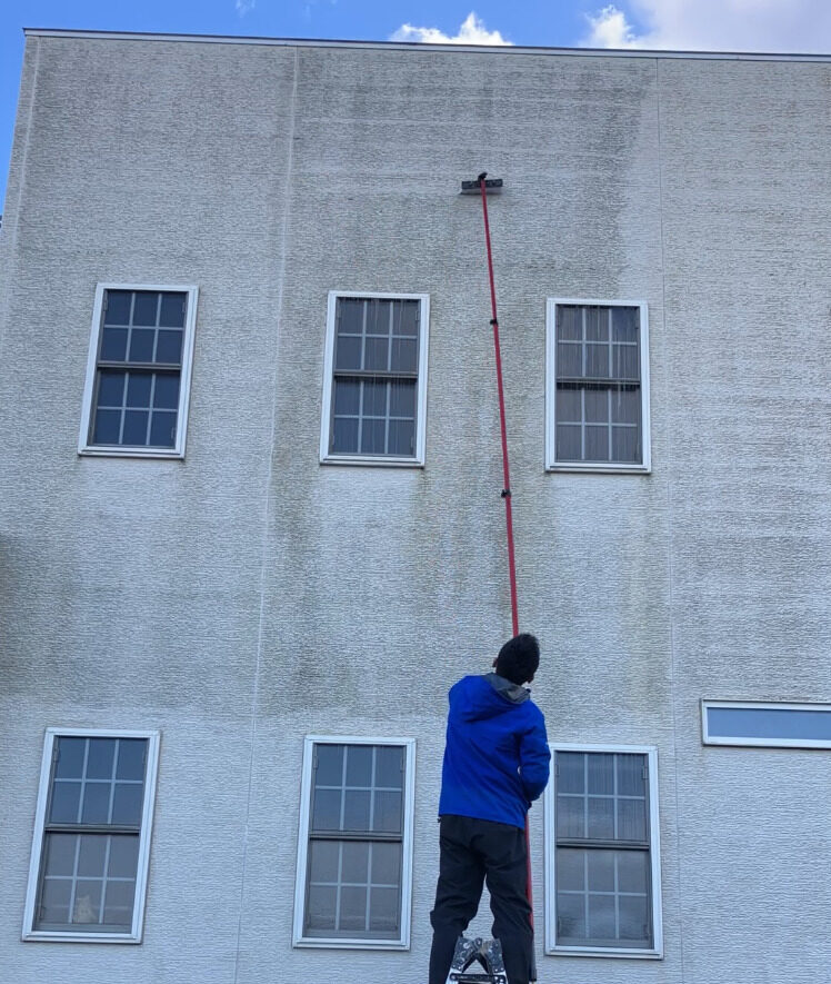 ウォッシャーズのオリジナル薬剤を用いて、外壁2面を丁寧に洗浄。