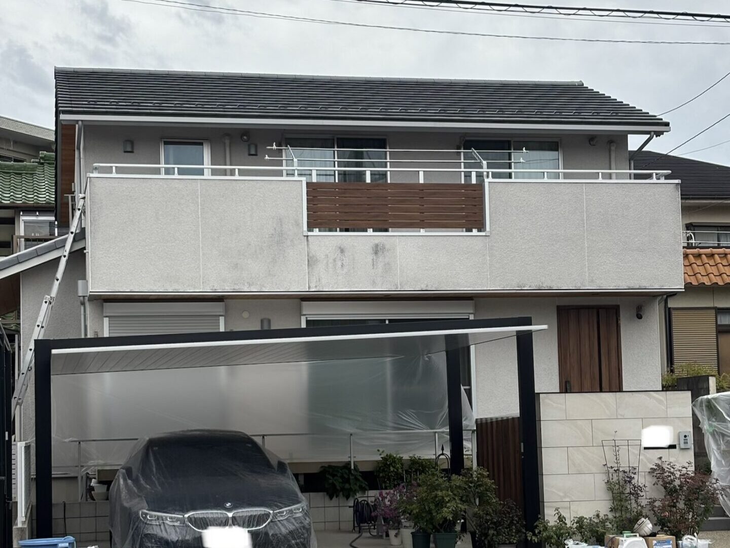 吸水性が高く、雨だれやコケ・カビ汚れが付きやすいという特徴もあります???? 築5年目に入り、「うっすら黒ずみが気になってきた」とのことでご相談をいただきました。 そとん壁は高圧洗浄を強く当てると表面が削れてしまうため、