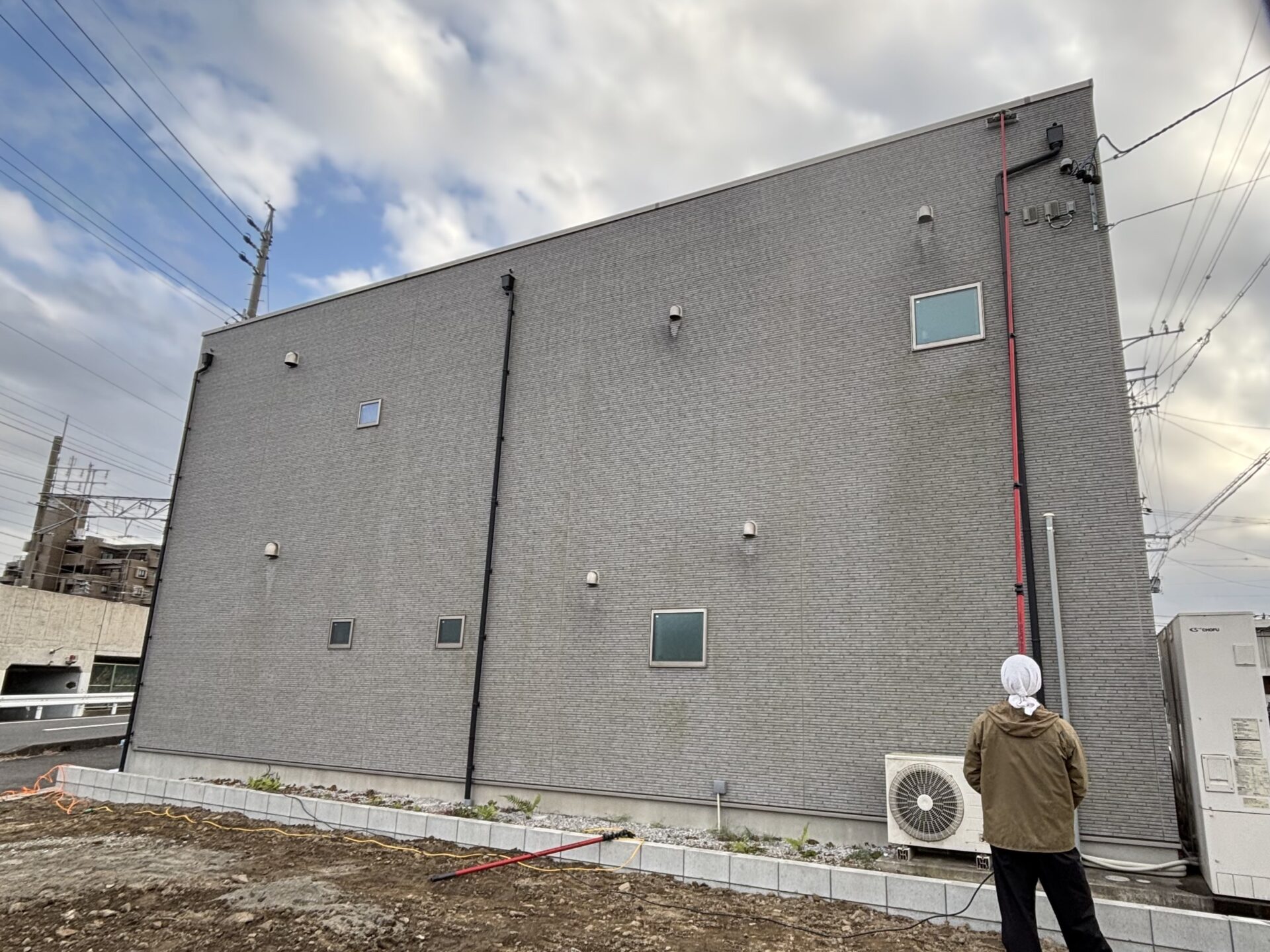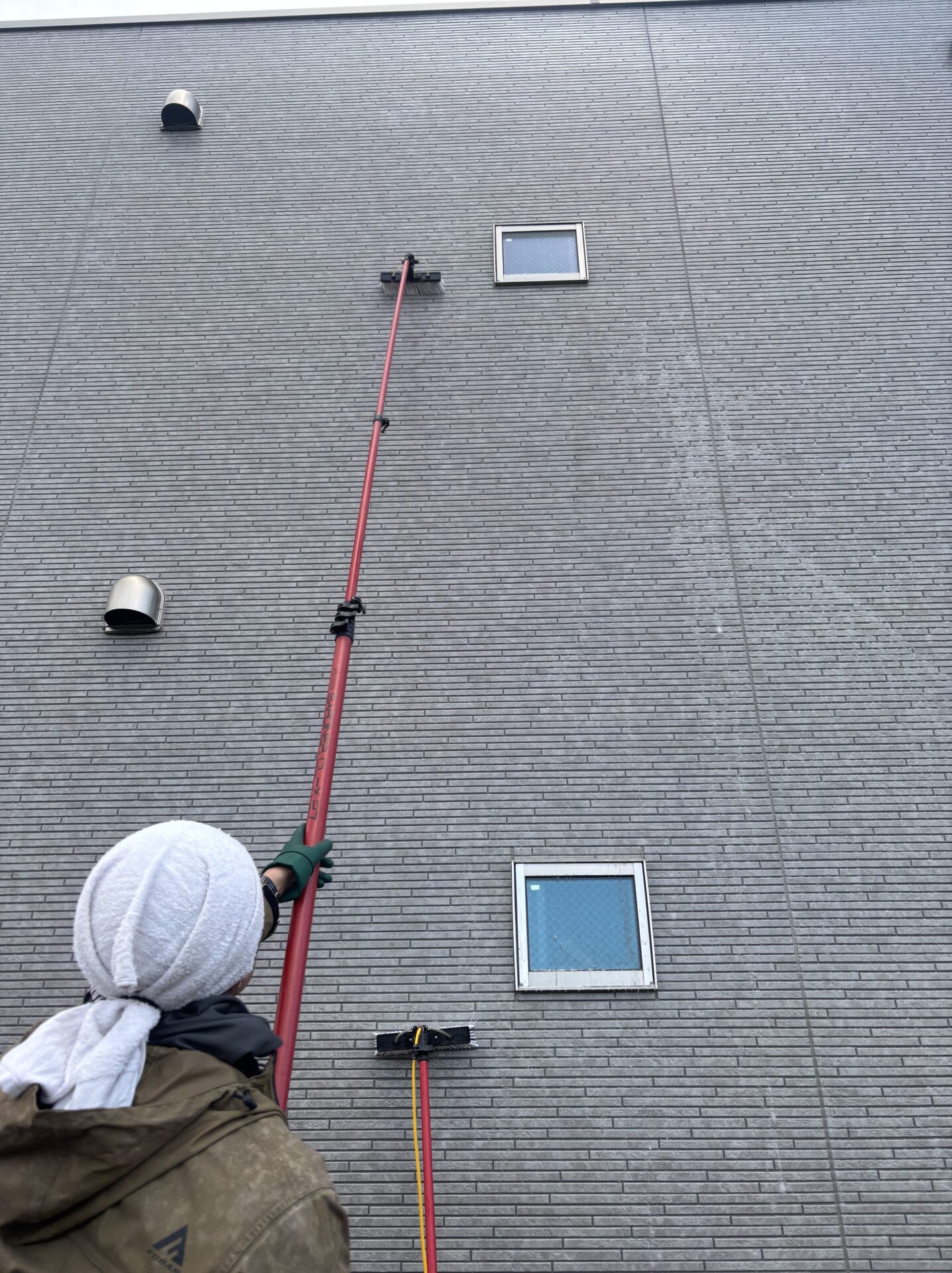 足場設置や本格的な工事が始まる前のタイミングで、外壁洗浄を行いました。