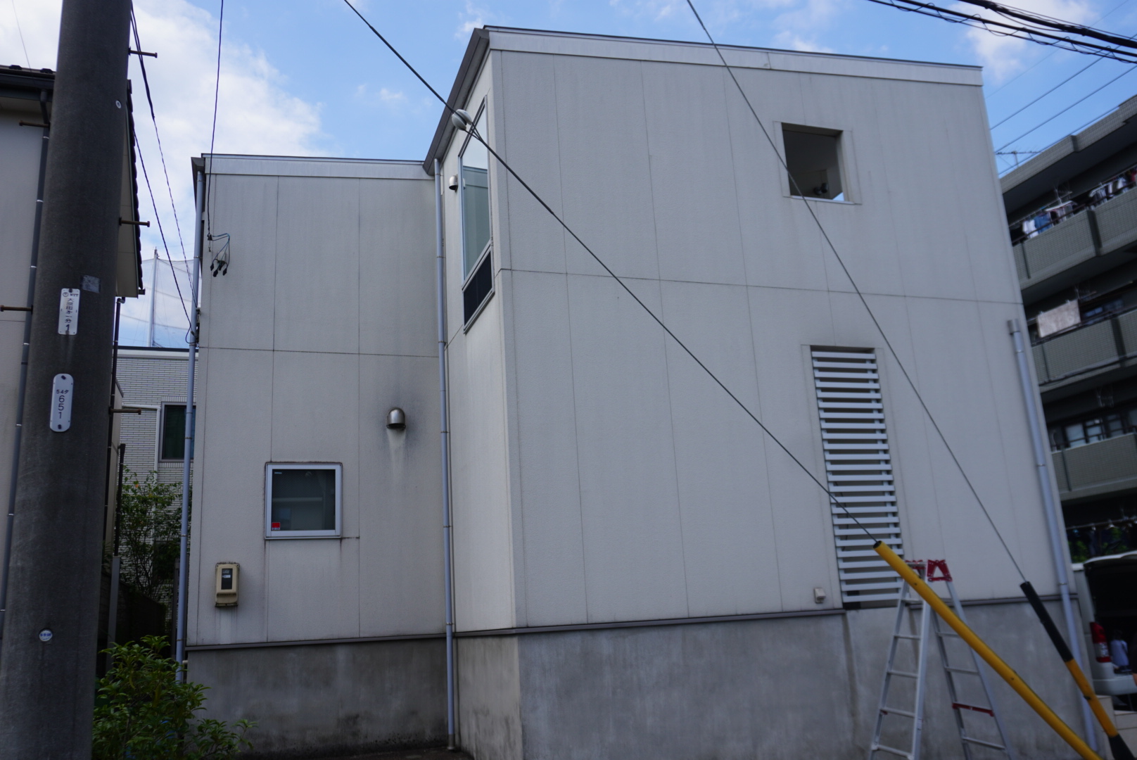 白い外壁が大気の汚れや、苔カビにより変色しており、