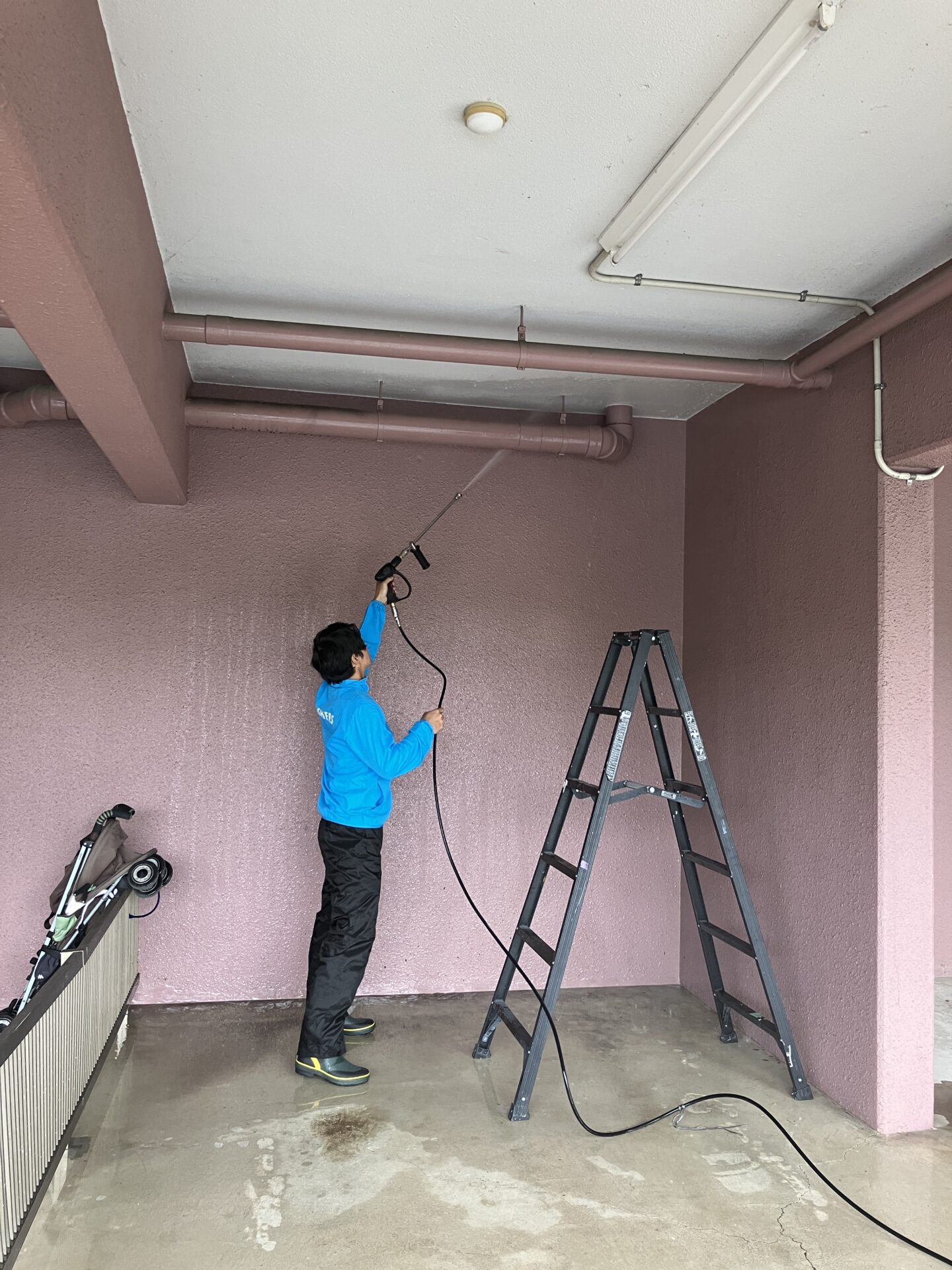 前回と同様に、廊下や内壁、軒天といった共有スペースに加え、敷地ブロックや駐輪場の土間、エントランス部分を洗浄しました☺